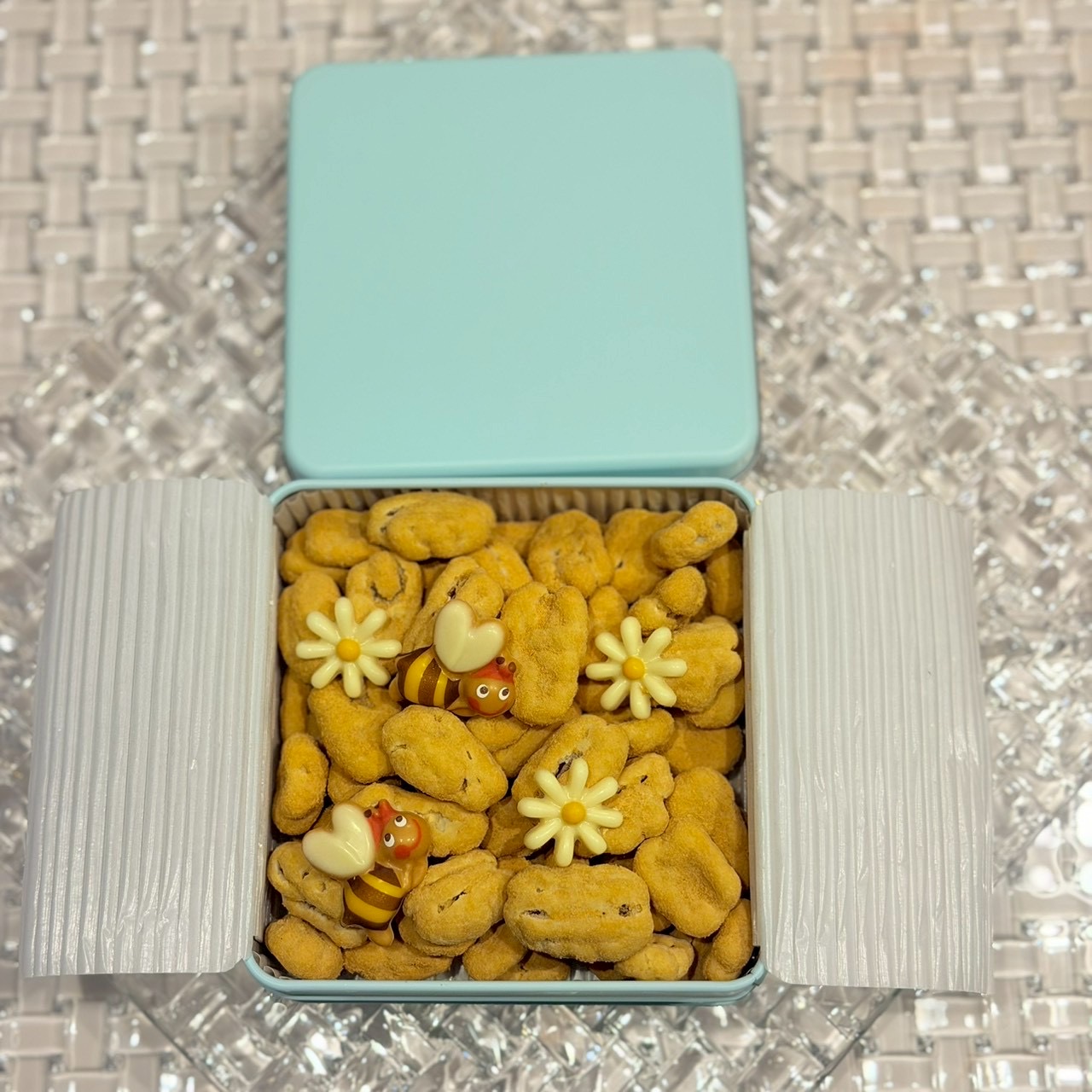 クーベルチュールチョコレートで丁寧にコーティングし、 キャラメルパウダーをまぶしたペカンナッツ。さらに幸せを運ぶミツバチとデイジーを添え**花畑ペカンナッツ**(キャラメル)が誕生しました。